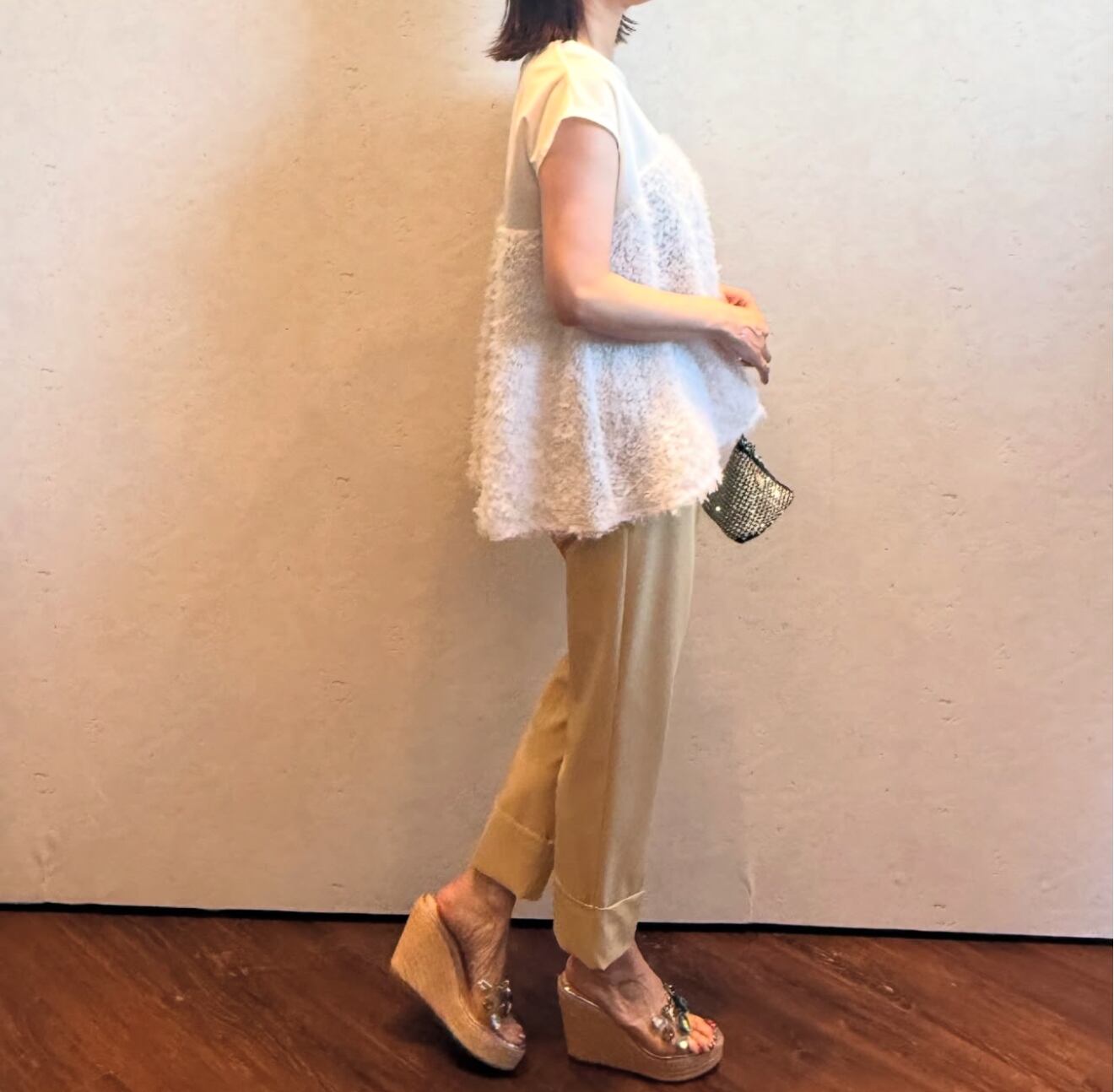 パステルカラーのパンツと合わせて爽やかな夏コーデに。