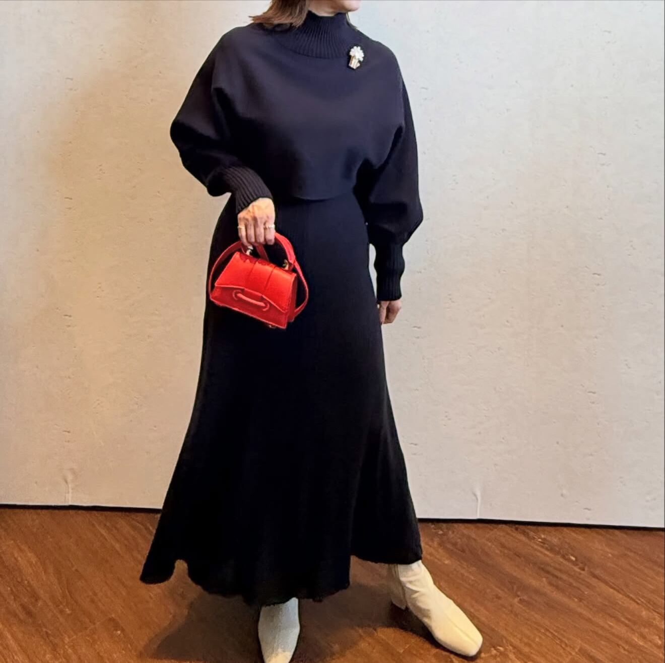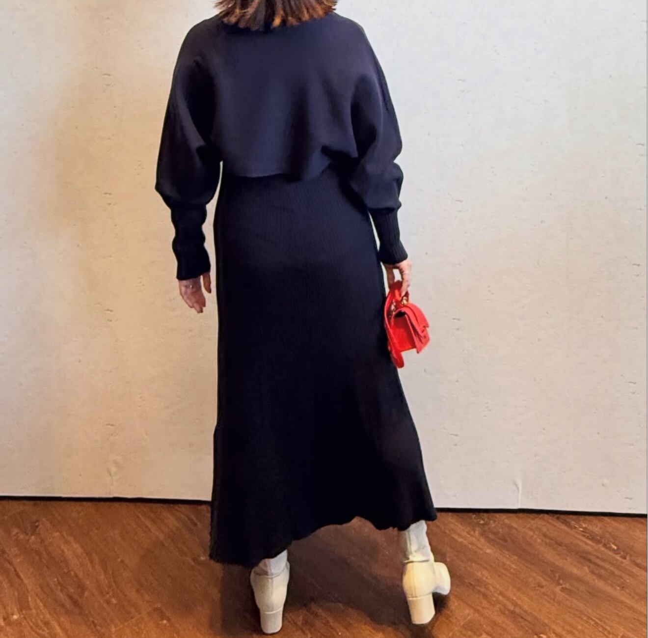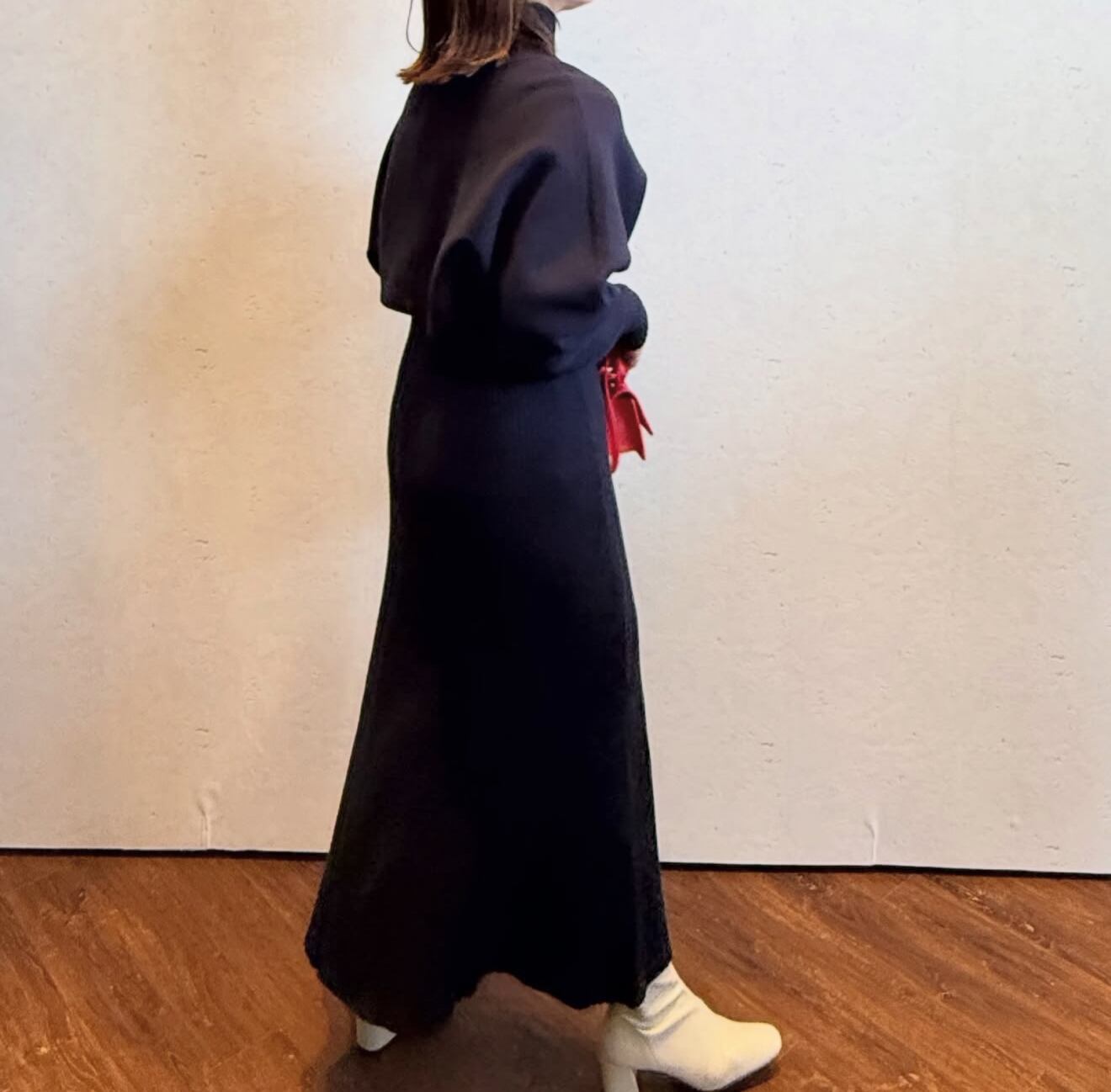 トップスのニットを脱ぐと、シンプルなニットワンピースになります。