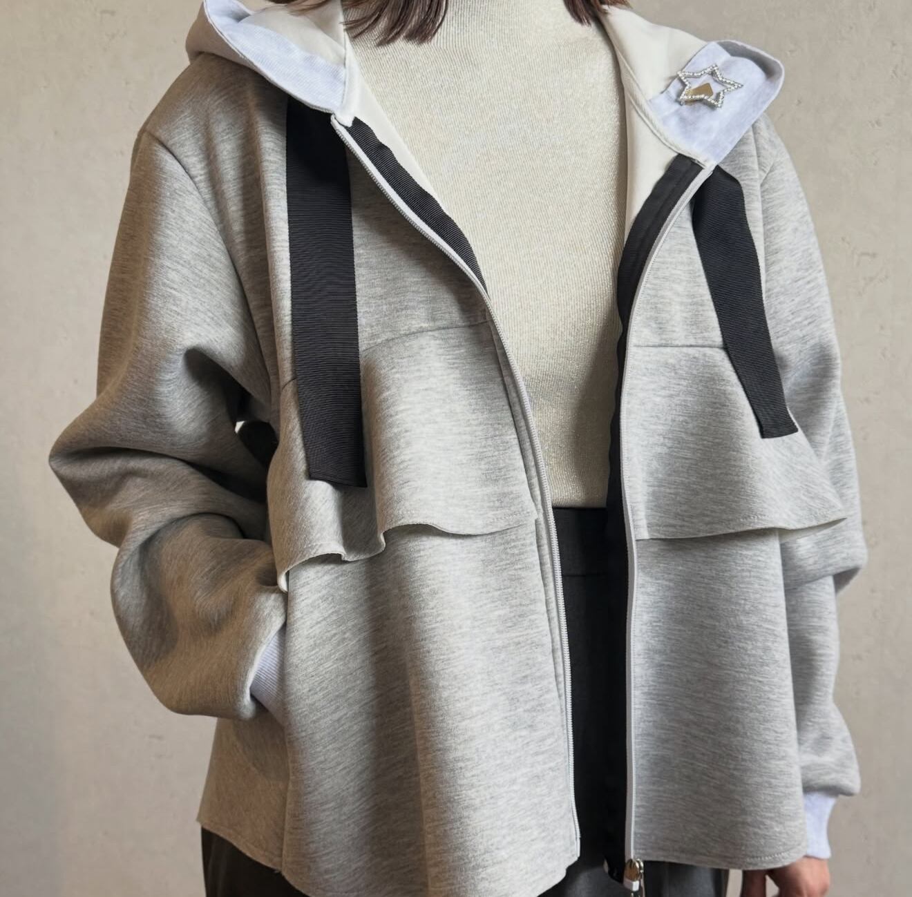 フードまわりのリブ素材、ややオーバーなサイズ感でこなれ感を演出。