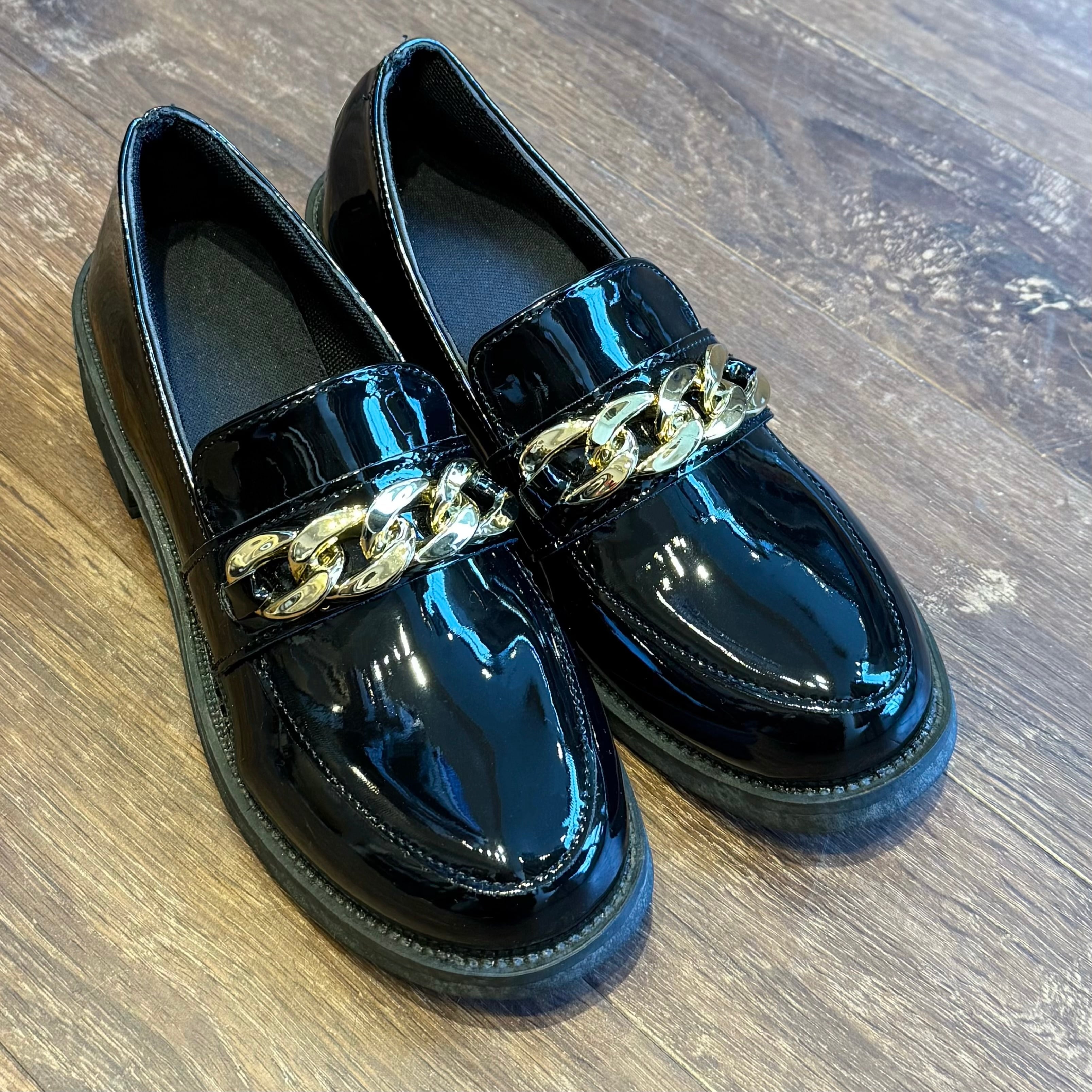 チェーンとエナメルでトレンド感満載のローファーになります。