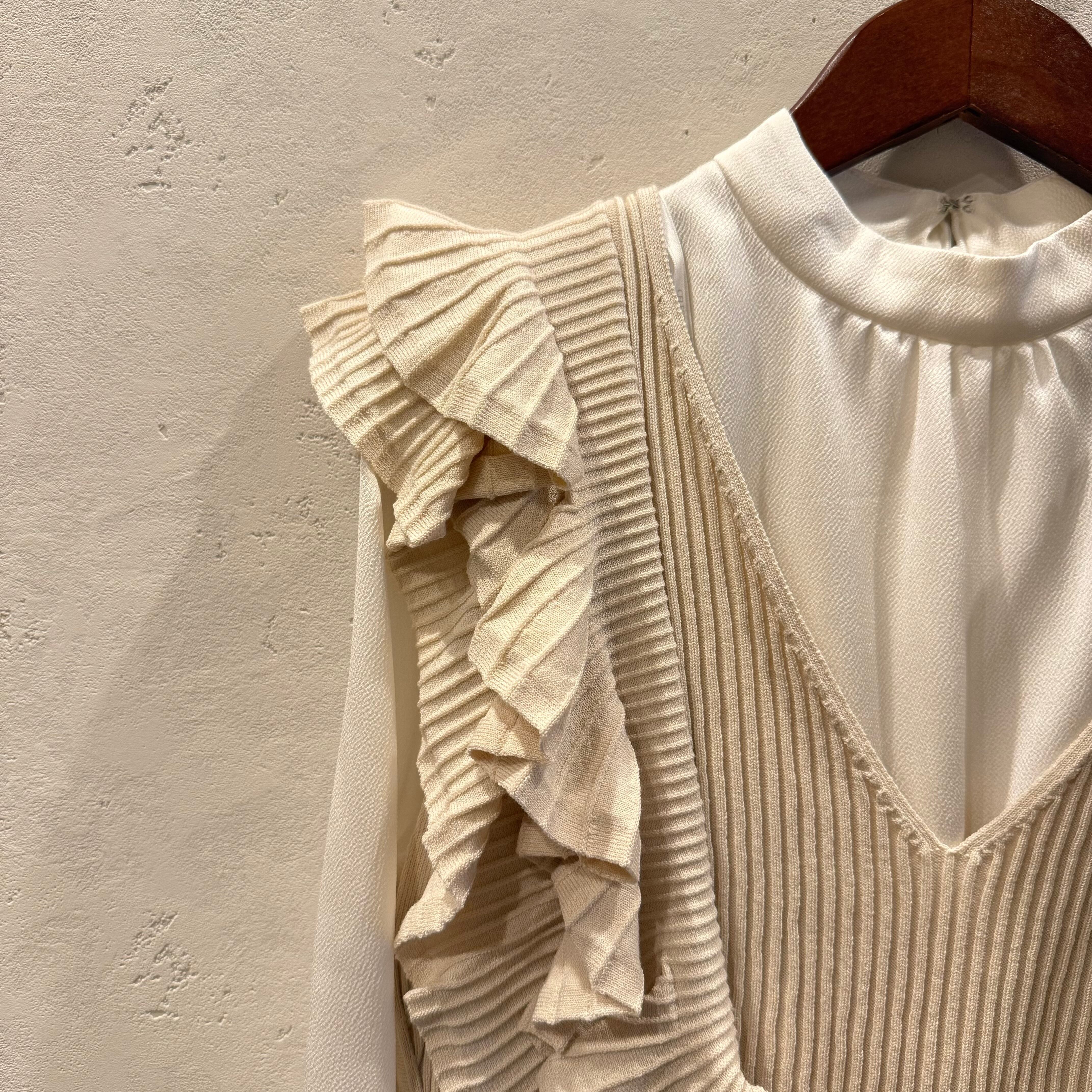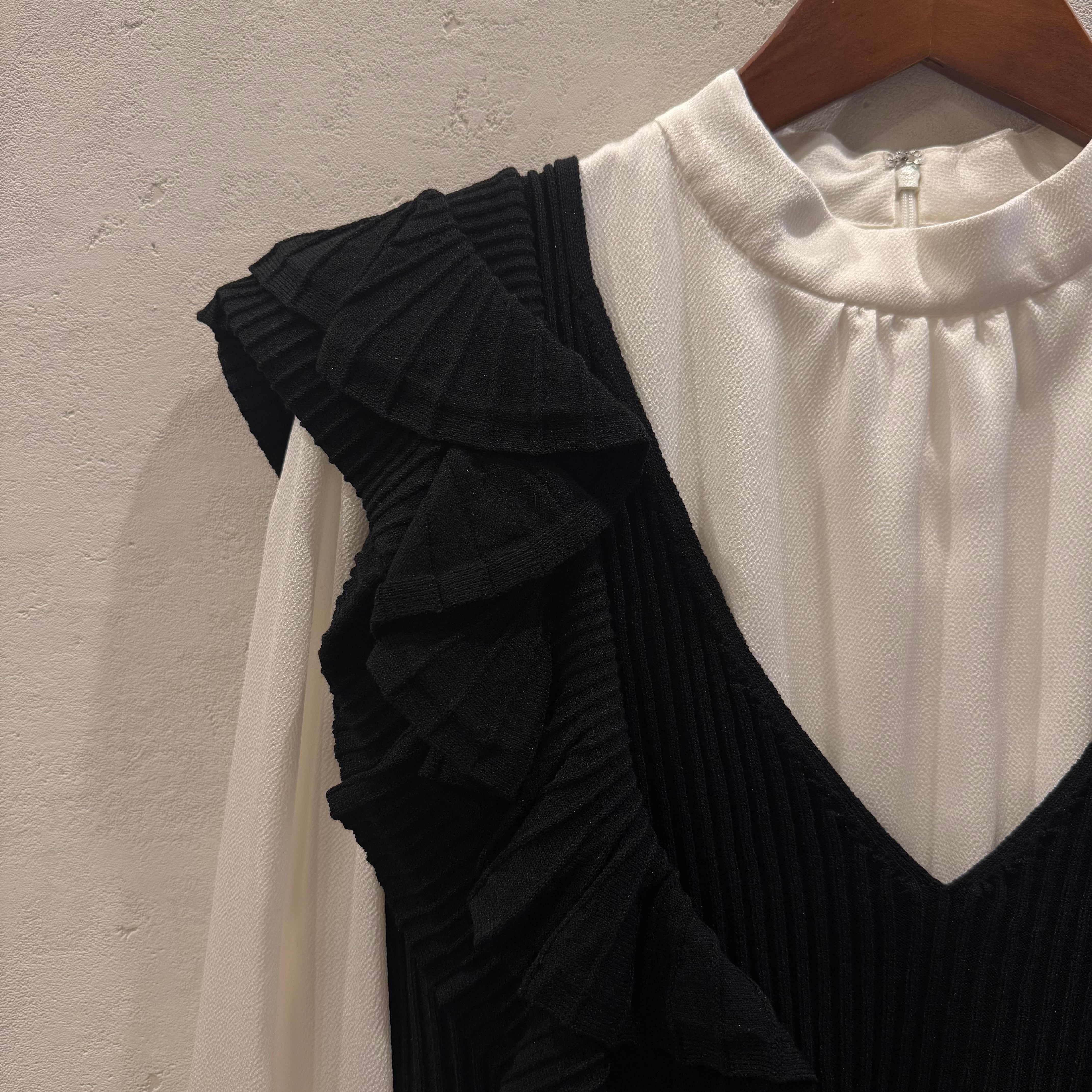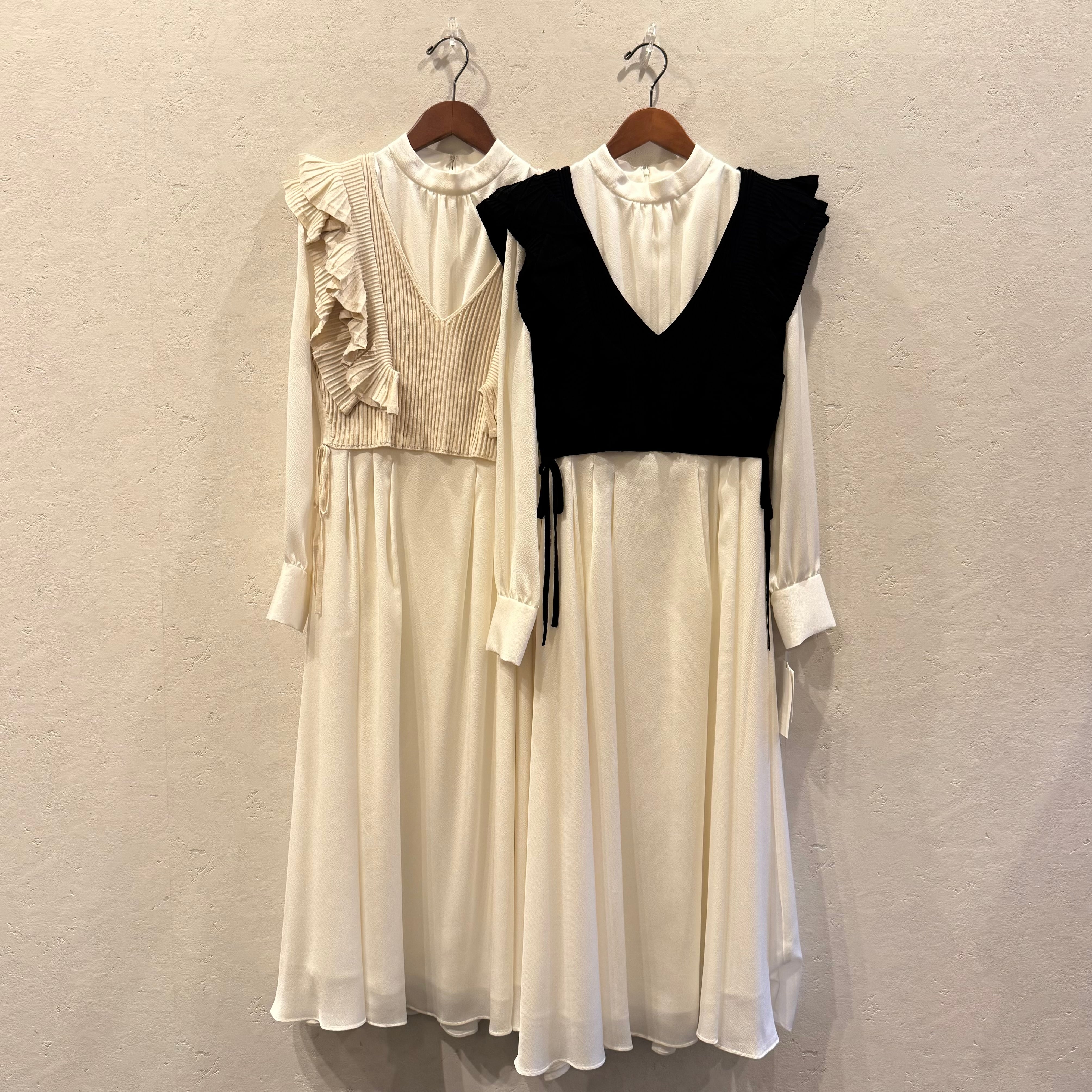 ベストは着るだけで存在感のあるラッフルデザインで、大胆なフリルがよりフェミニンな印象にしてくれます。 深めのVネックにしているので、ワンピースのスタンドカラーとの相性も良く、抜け感のある雰囲気を演出します。 Vネックの深さを前後で変えているので、お好みに併せて前後着用できます。